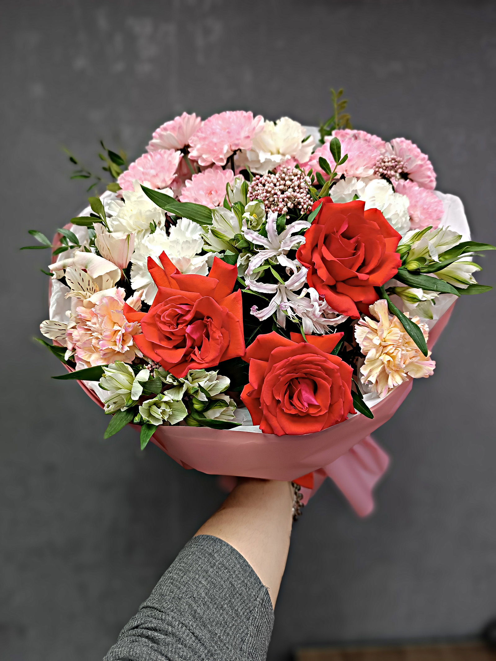 роза диантус альстромерия хризантема кустовая зелень оформление