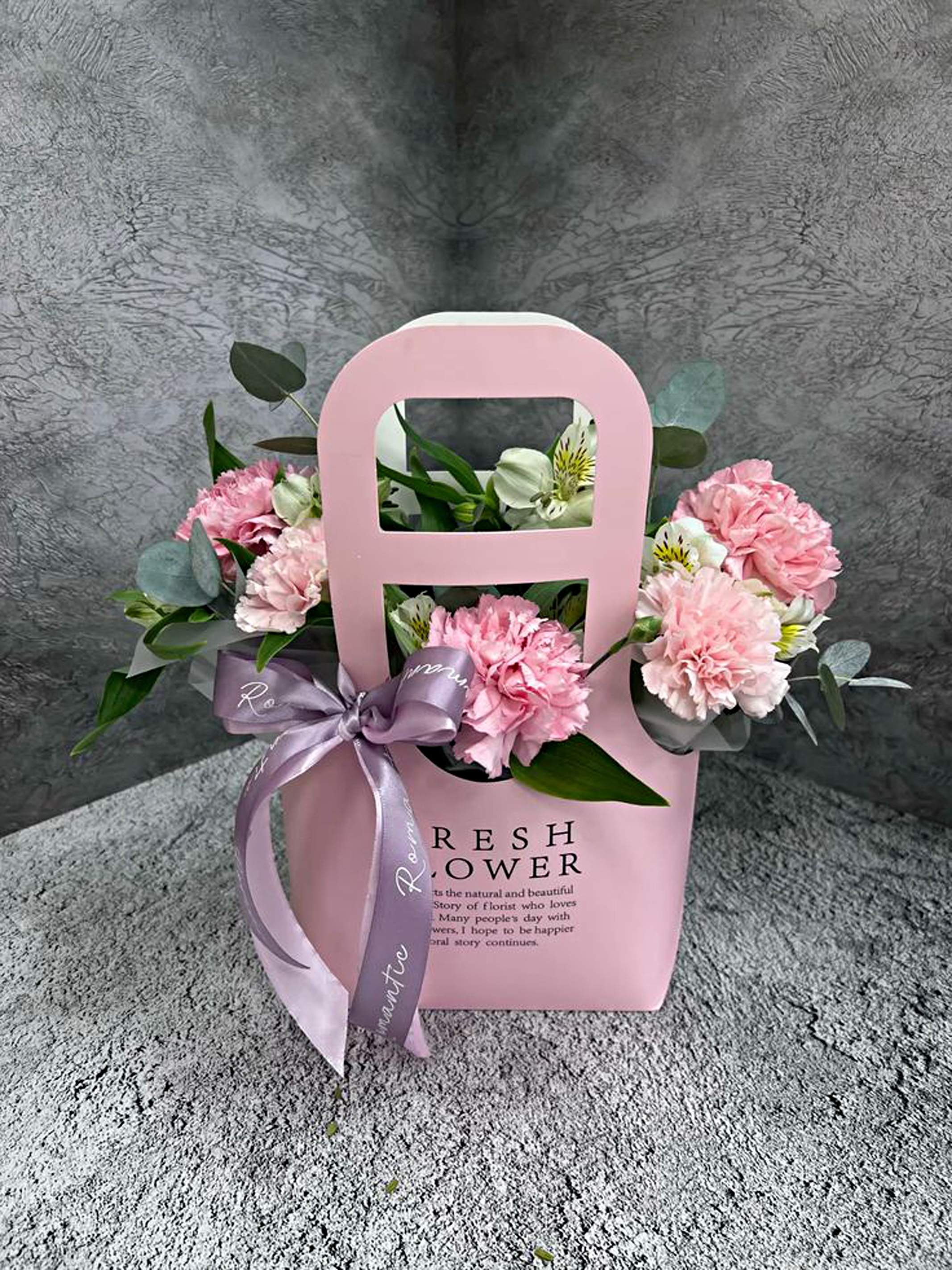 сумочка диантус альстромерия эвкалипт Каждый букет уникален, поэтому его оттенки и декор могут незначительно отличаться от фото. Наш флорист с радостью поможет подобрать идеальный состав и уточнит наличие цветов для вашего заказа.