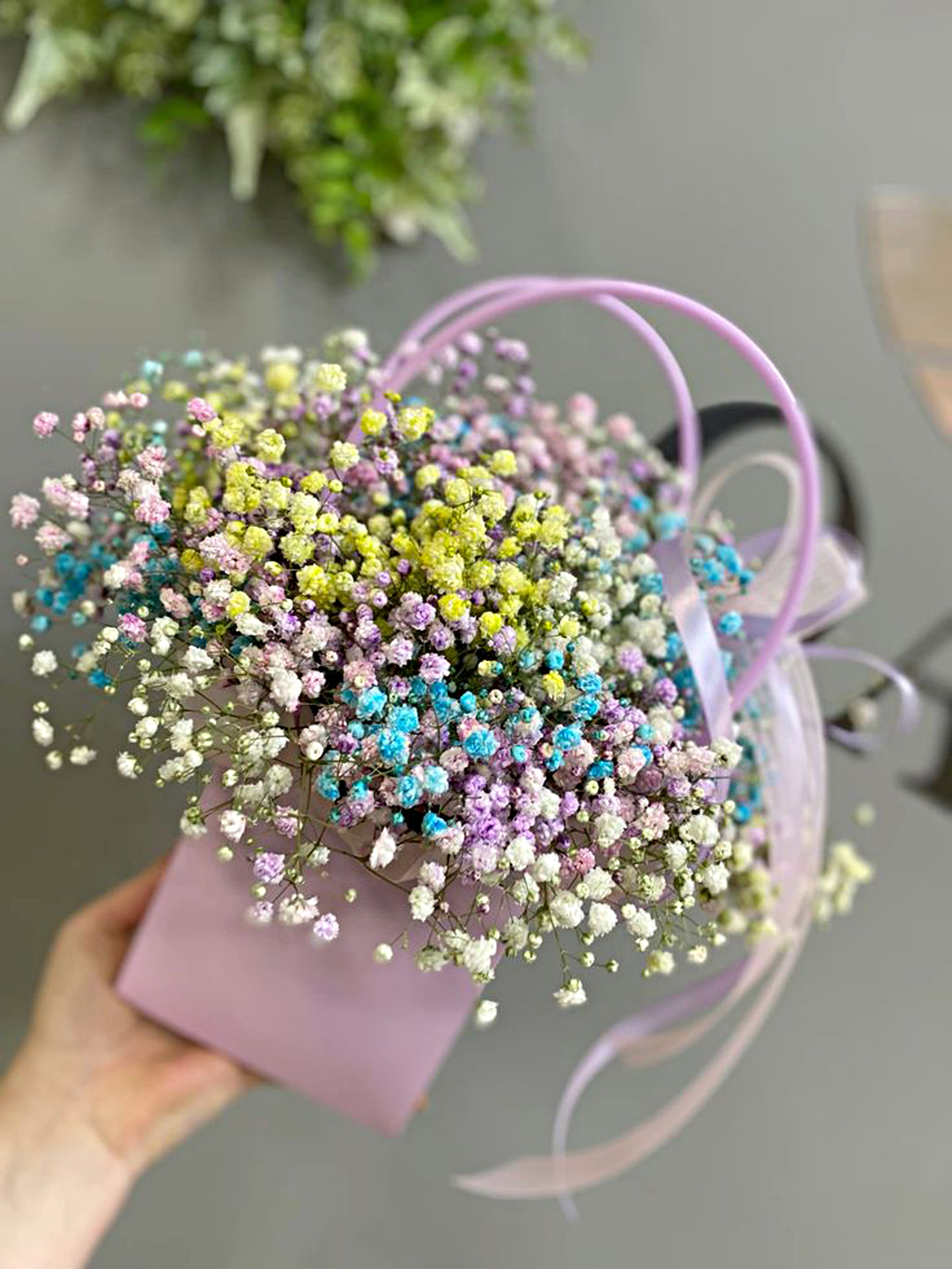 сумочка гипсофила Каждый букет уникален, поэтому его оттенки и декор могут незначительно отличаться от фото. Наш флорист с радостью поможет подобрать идеальный состав и уточнит наличие цветов для вашего заказа.