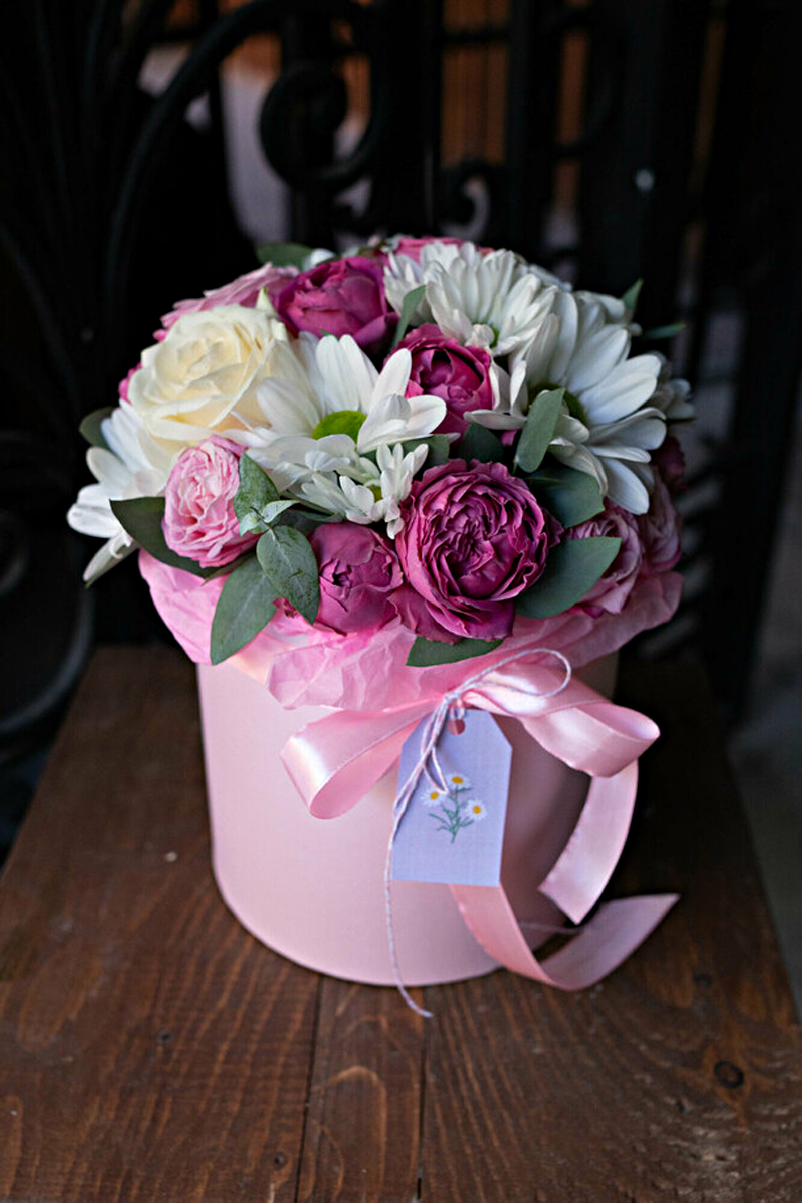 коробка роза роза кустовая хризантема кустовая эвкалипт Каждый букет уникален, поэтому его оттенки и декор могут незначительно отличаться от фото. Наш флорист с радостью поможет подобрать идеальный состав и уточнит наличие цветов для вашего заказа.