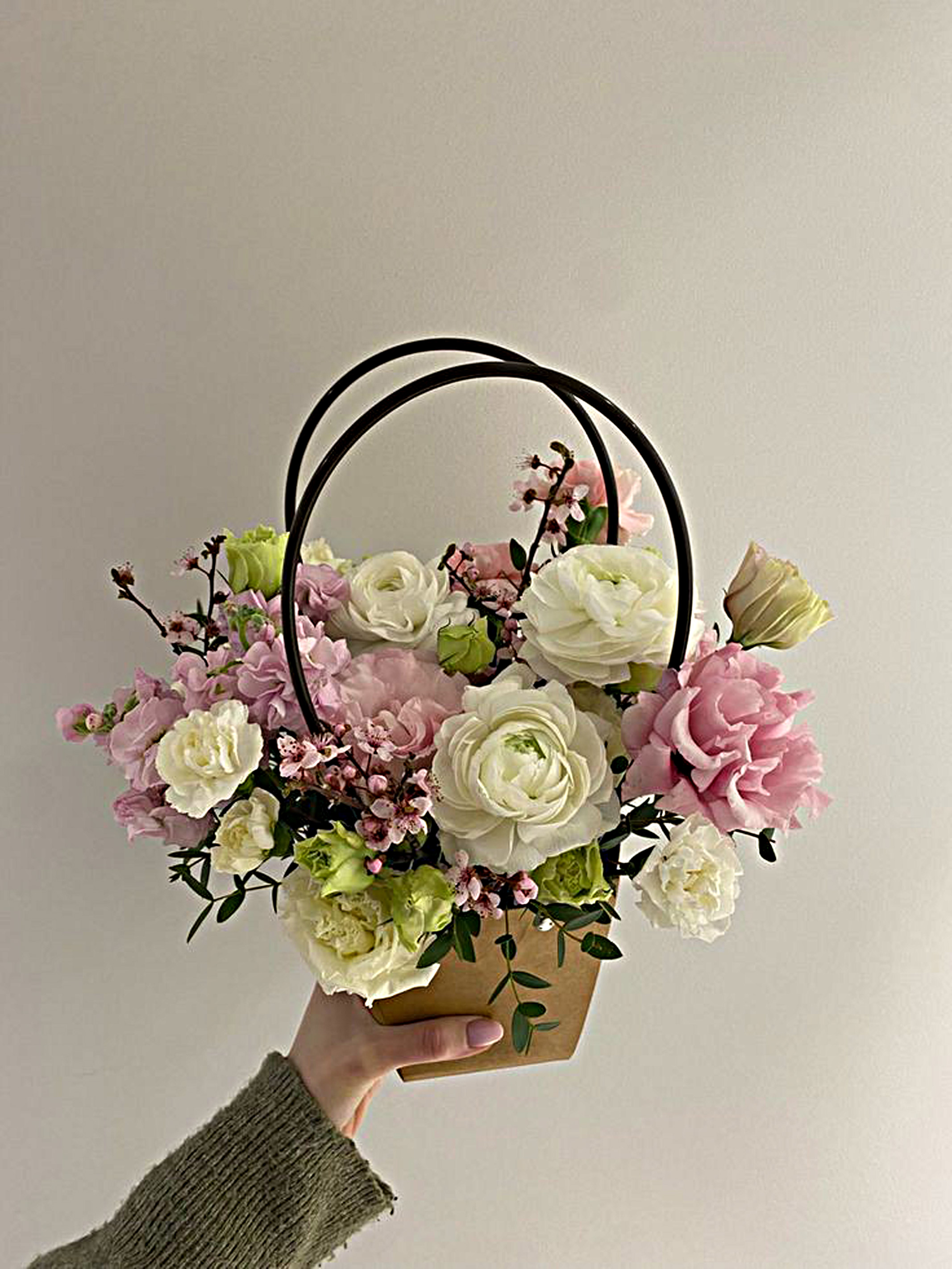 сумочка ранункулюс эустома диантус диантус кустовой эвкалипт Каждый букет уникален, поэтому его оттенки и декор могут незначительно отличаться от фото. Наш флорист с радостью поможет подобрать идеальный состав и уточнит наличие цветов для вашего заказа.