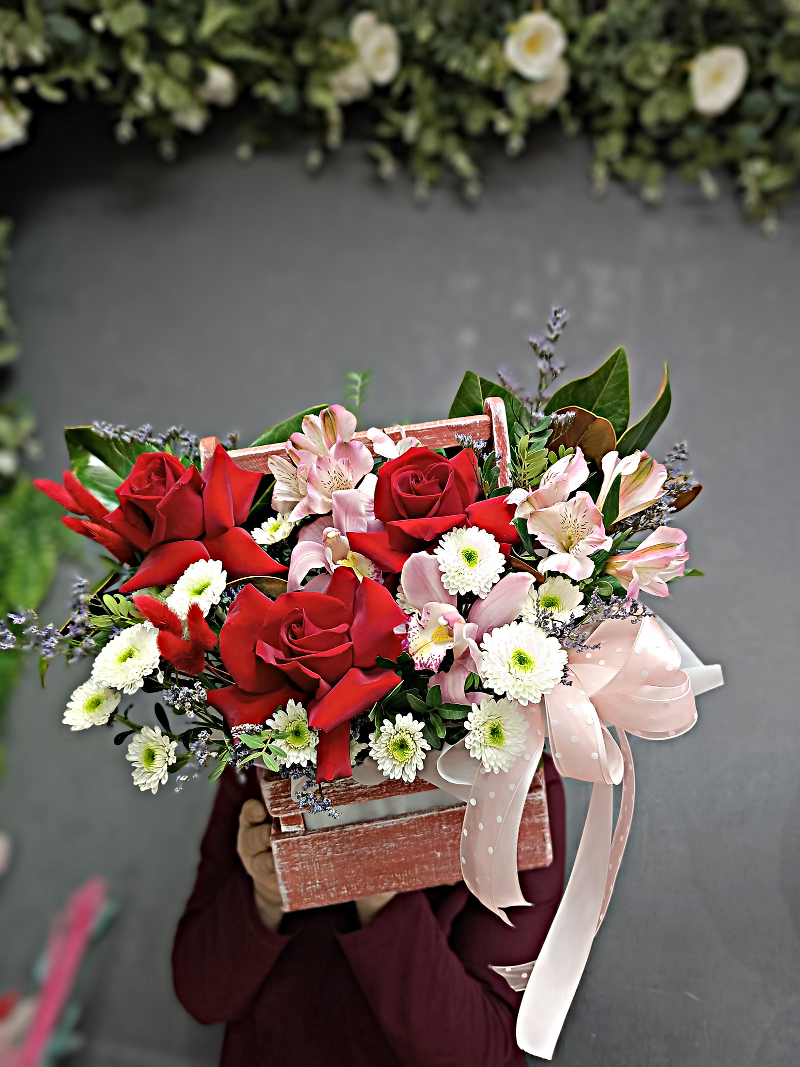 ящик роза кустовая хризантема альстрмерия сухоцвет зелень Каждый букет уникален, поэтому его оттенки и декор могут незначительно отличаться от фото. Наш флорист с радостью поможет подобрать идеальный состав и уточнит наличие цветов для вашего заказа.