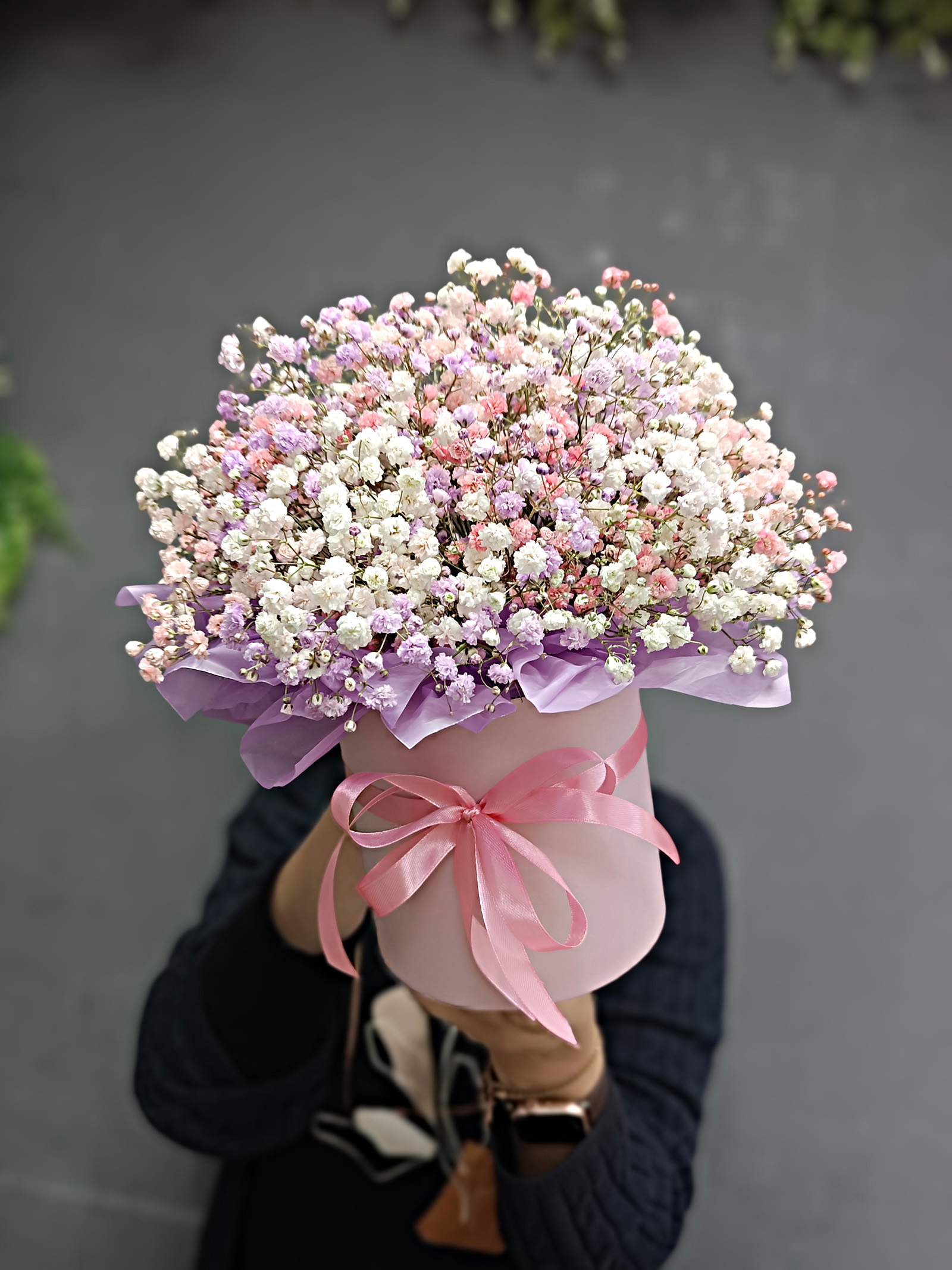 коробка гипсофила Каждый букет уникален, поэтому его оттенки и декор могут незначительно отличаться от фото. Наш флорист с радостью поможет подобрать идеальный состав и уточнит наличие цветов для вашего заказа.