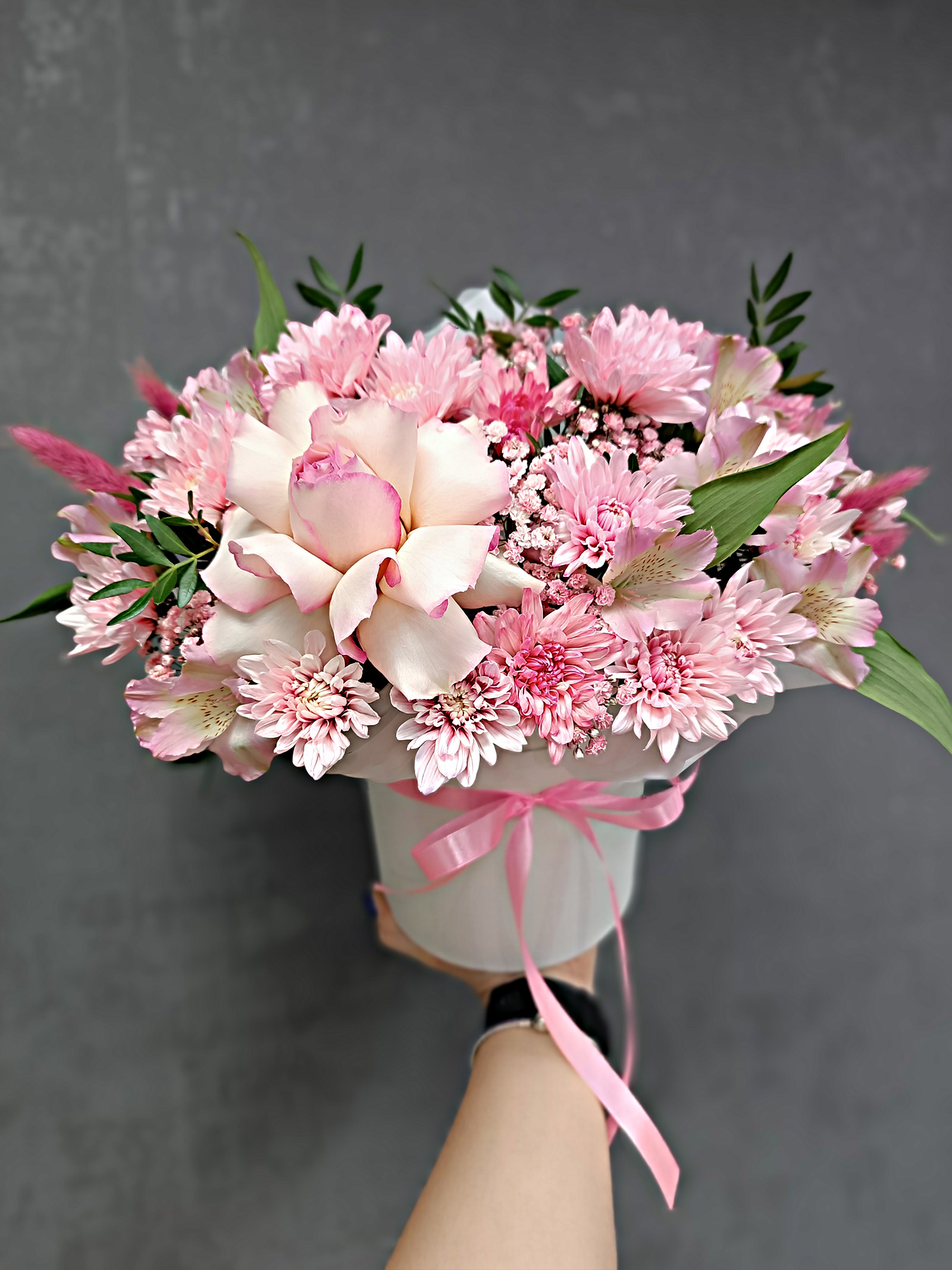 коробка роза хризантема кустовая альстромерия сухоцвет зелень Каждый букет уникален, поэтому его оттенки и декор могут незначительно отличаться от фото. Наш флорист с радостью поможет подобрать идеальный состав и уточнит наличие цветов для вашего заказа.