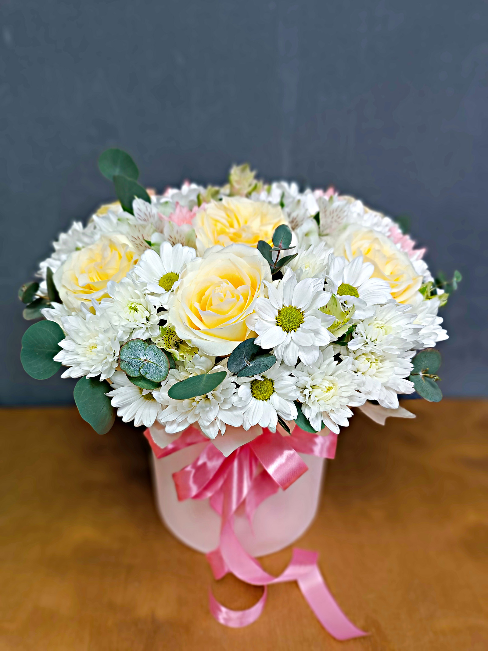 коробка роза хризантема кустовая эвкалипт Каждый букет уникален, поэтому его оттенки и декор могут незначительно отличаться от фото. Наш флорист с радостью поможет подобрать идеальный состав и уточнит наличие цветов для вашего заказа.
