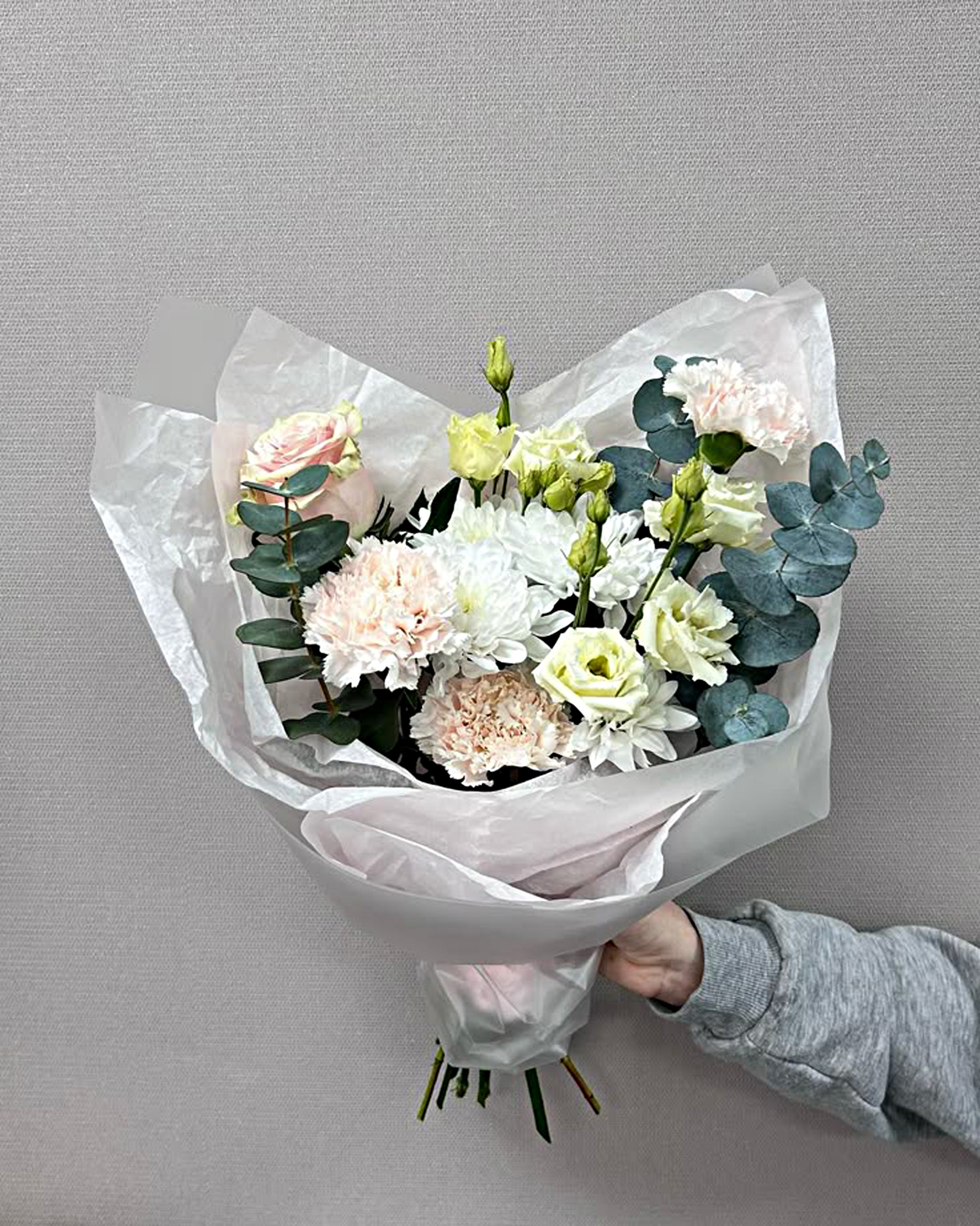 1 хризантема кустовая 3 диантус 2 эустома 1 роза эвкалипт оформление