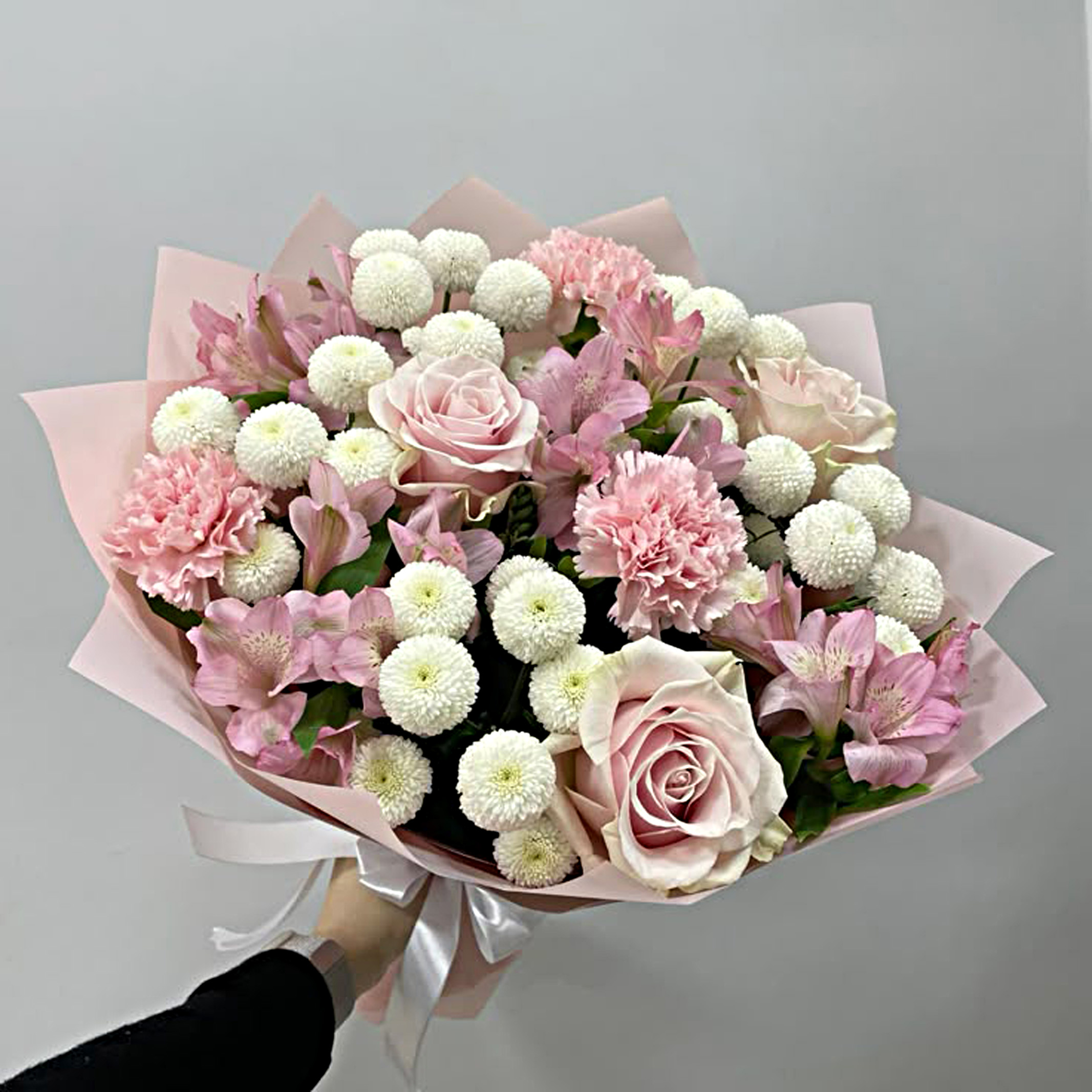 3 роза 5 хризантема кустовая 3 диантус 4 альстромерия зелень оформление