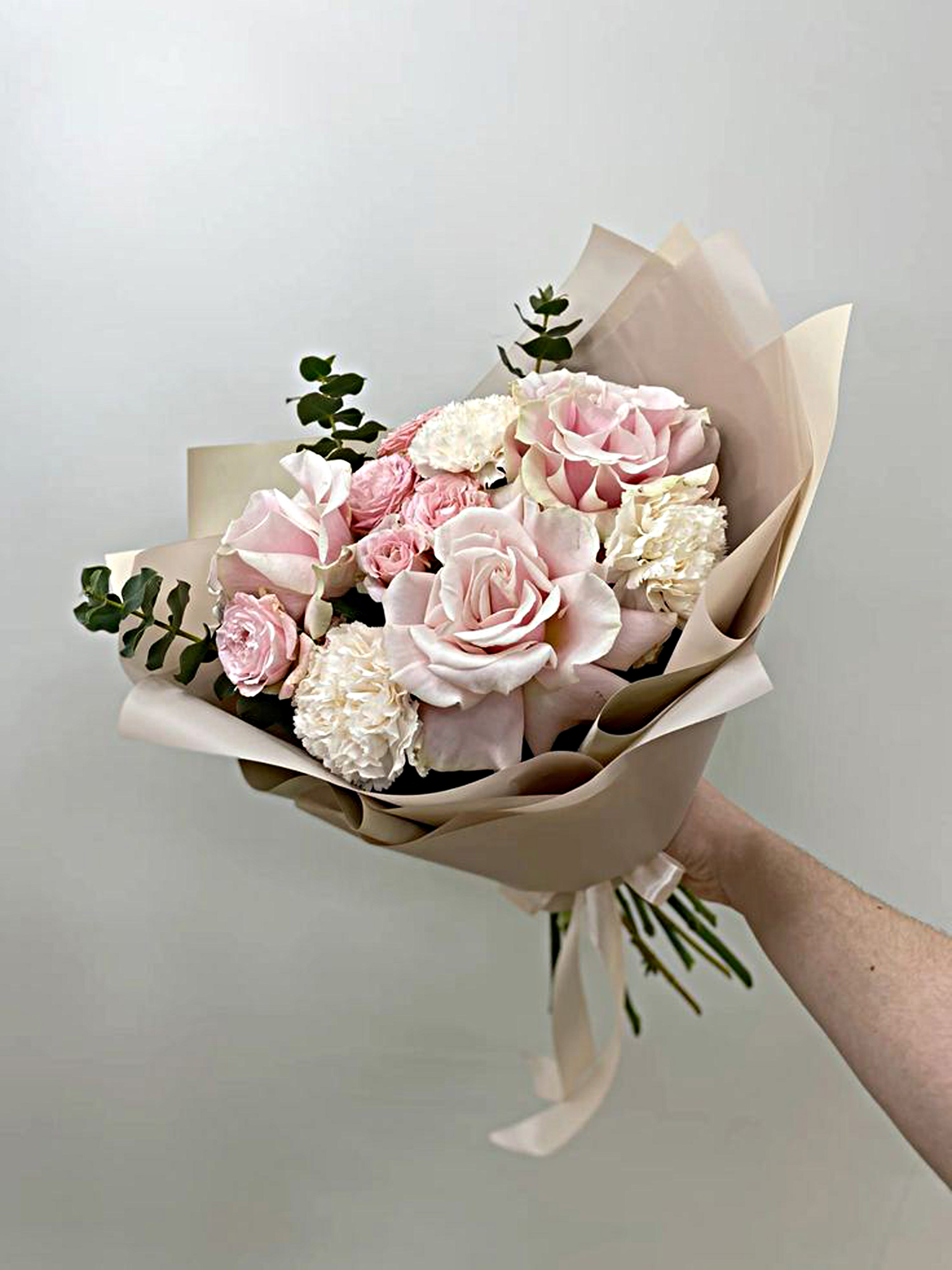 3 роза 3 диантус 2 кустовая роза эвкалипт оформление